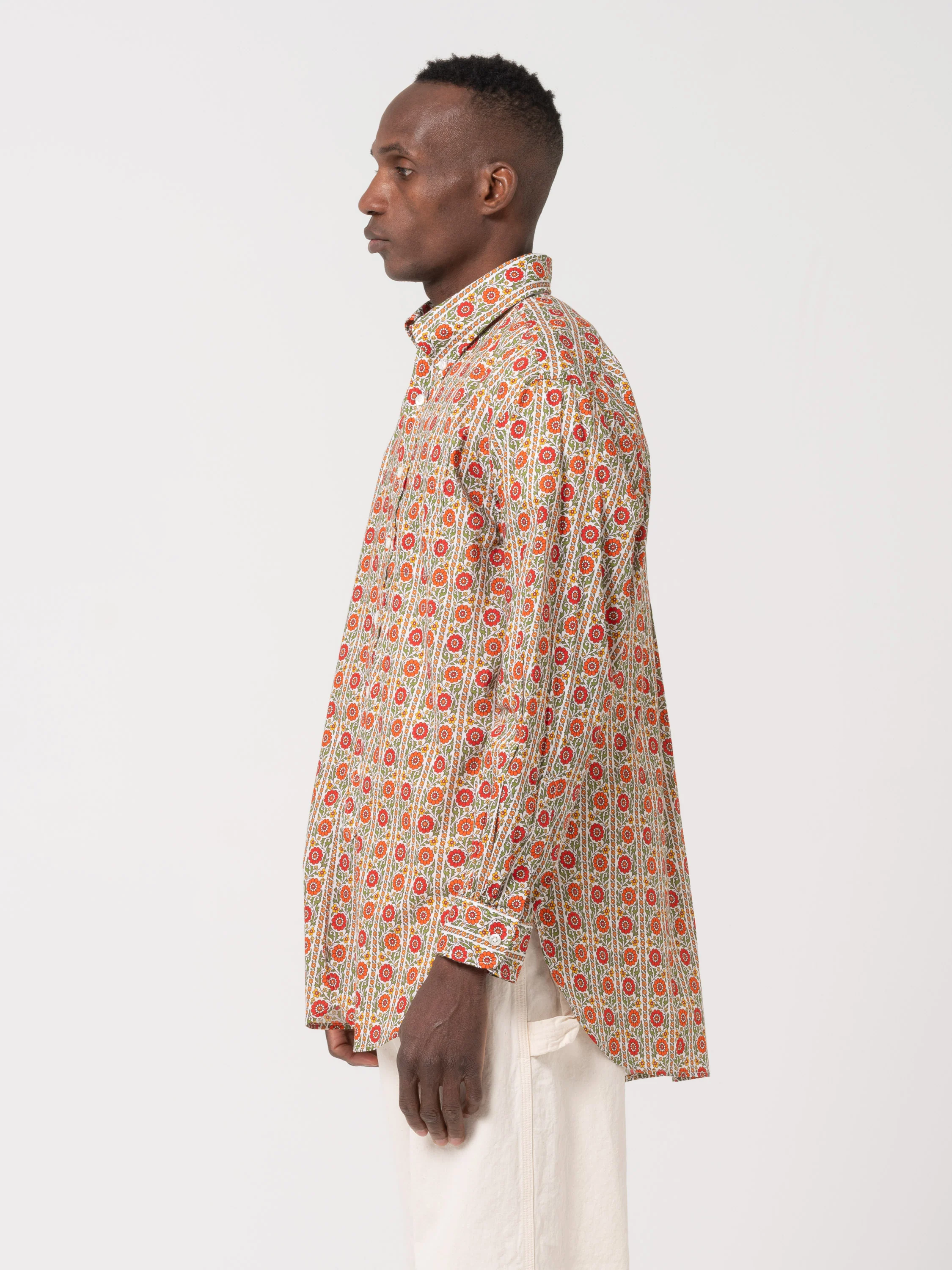 Une chemise classique représentant le cœur d'Engineering Garments, conçue avec des motifs inspirés des chemises habillées fabriquées au 19ème siècle. Le design intègre de nombreux détails trouvés tels que l'ourlet arrondi superposé, les soufflets sous les bras et les fentes latérales profondes. Le montage ne se fait qu’avec une seule aiguille, ce qui demande beaucoup de travail et de temps. Le résultat offre à la fois de belles coutures et une grande durabilité. Le tissu de cette pièce présente un magnifique imprimé floral avec une touche délicate.