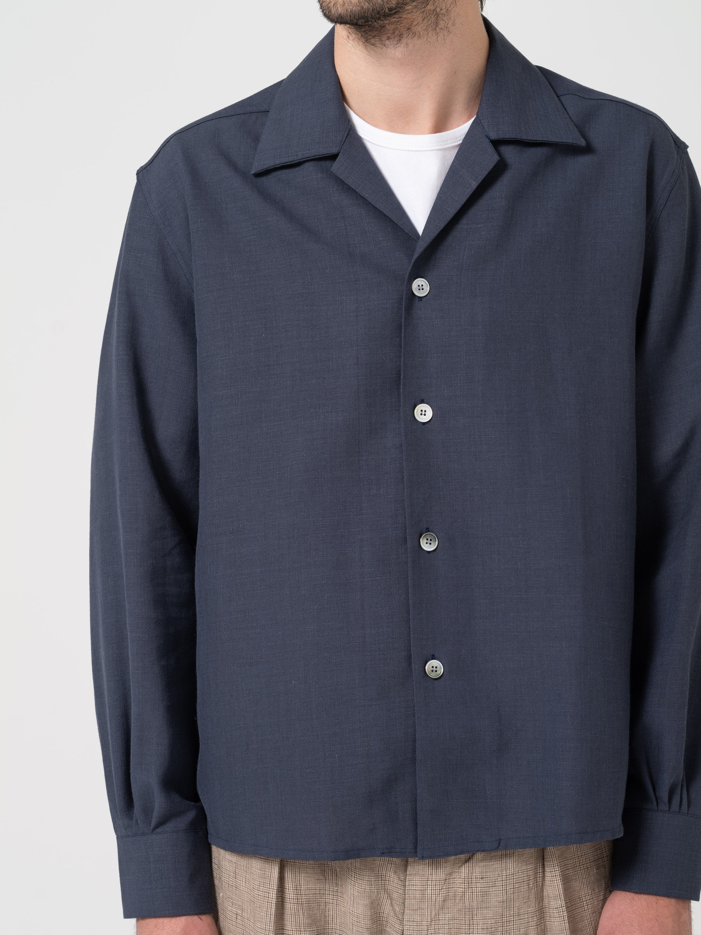 Cette chemise à col ouvert se porte comme une veste. Fabriquée à partir d’un mélange de laine et de lin, elle se portera aussi bien pour un évènement que pour le quotidien.