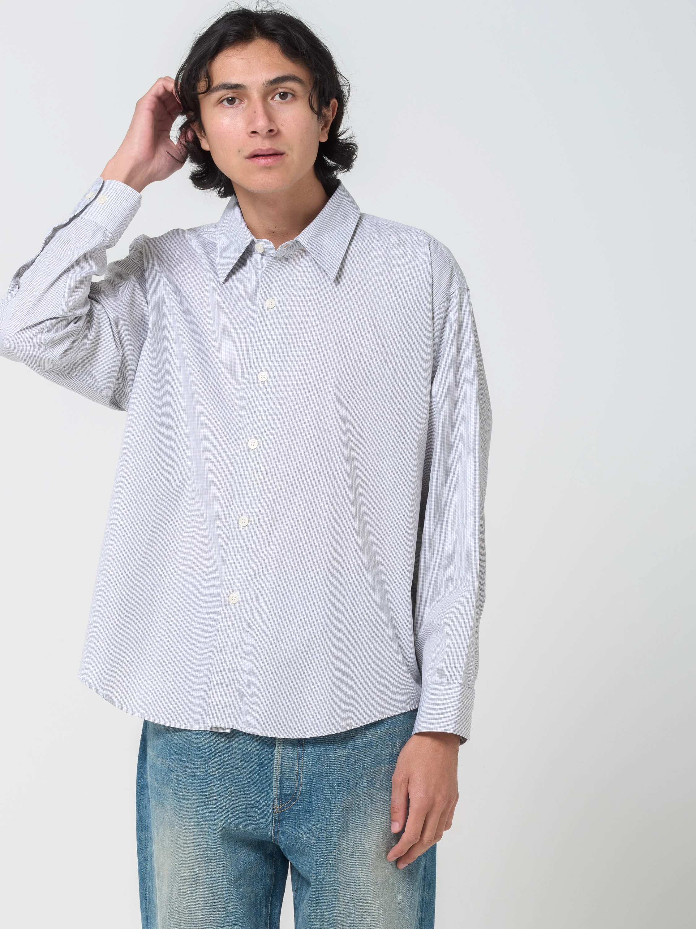 La chemise Exact a une coupe oversize avec des épaules tombantes et un ourlet arrondi. Elle est dotée d'un col italien et d'un devant épuré, sans poche poitrine ni patte de boutonnage. Confectionnée en popeline de coton légère, issue d’un tissu deadstock, elle présente une texture subtile, avec un motif à micro-carreaux gris sur fond blanc et une fine ligne verte.