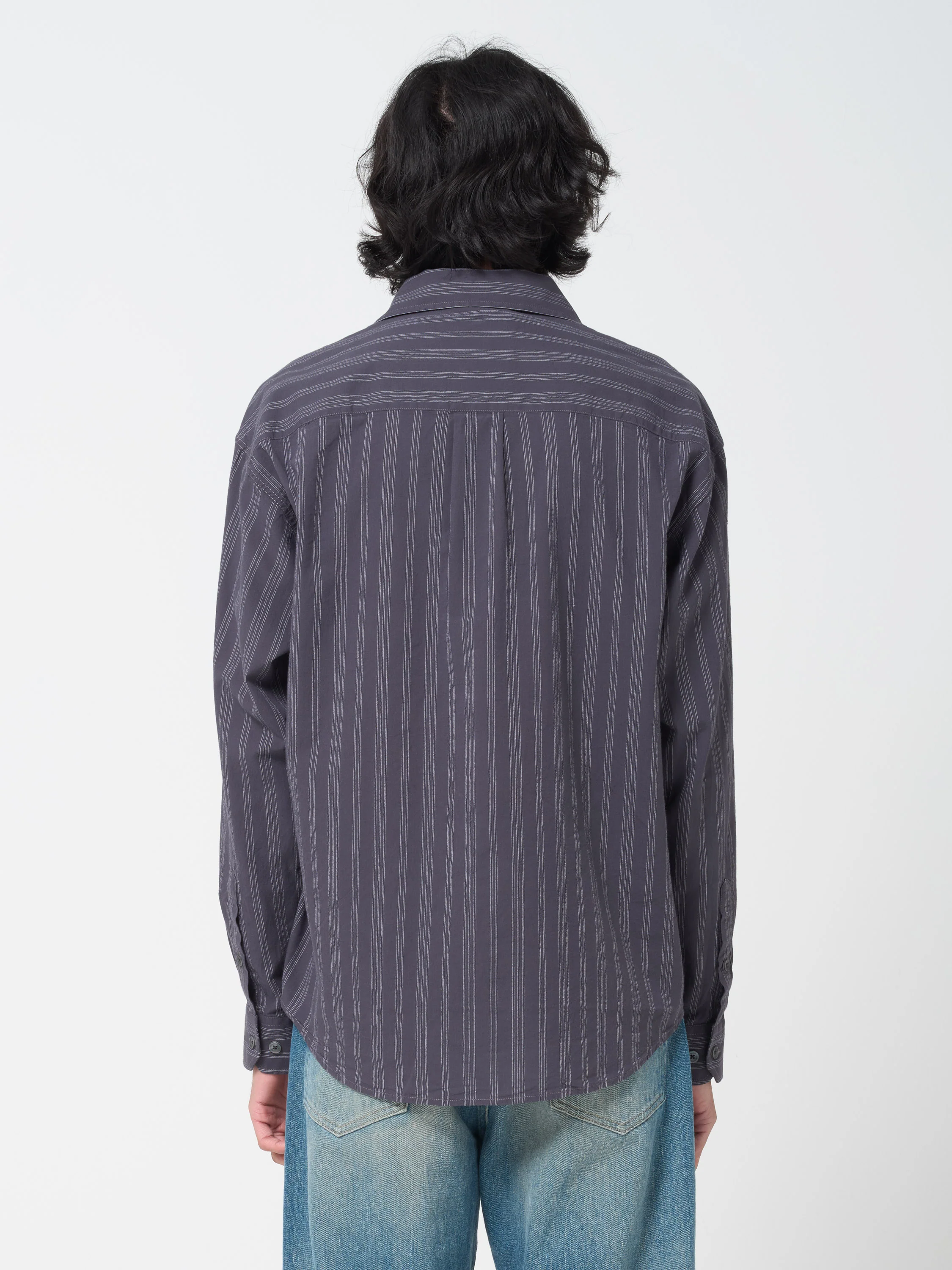La chemise Executive présente une coupe décontractée avec des épaules tombantes et un ourlet arrondi. Elle est dotée d'une patte de boutonnage, d'un col italien, de plis d'empiècement dos et d'une poche poitrine. Confectionnée dans un tissu en coton doux et léger, elle arbore un motif à rayures blanches sur fond gris foncé.
