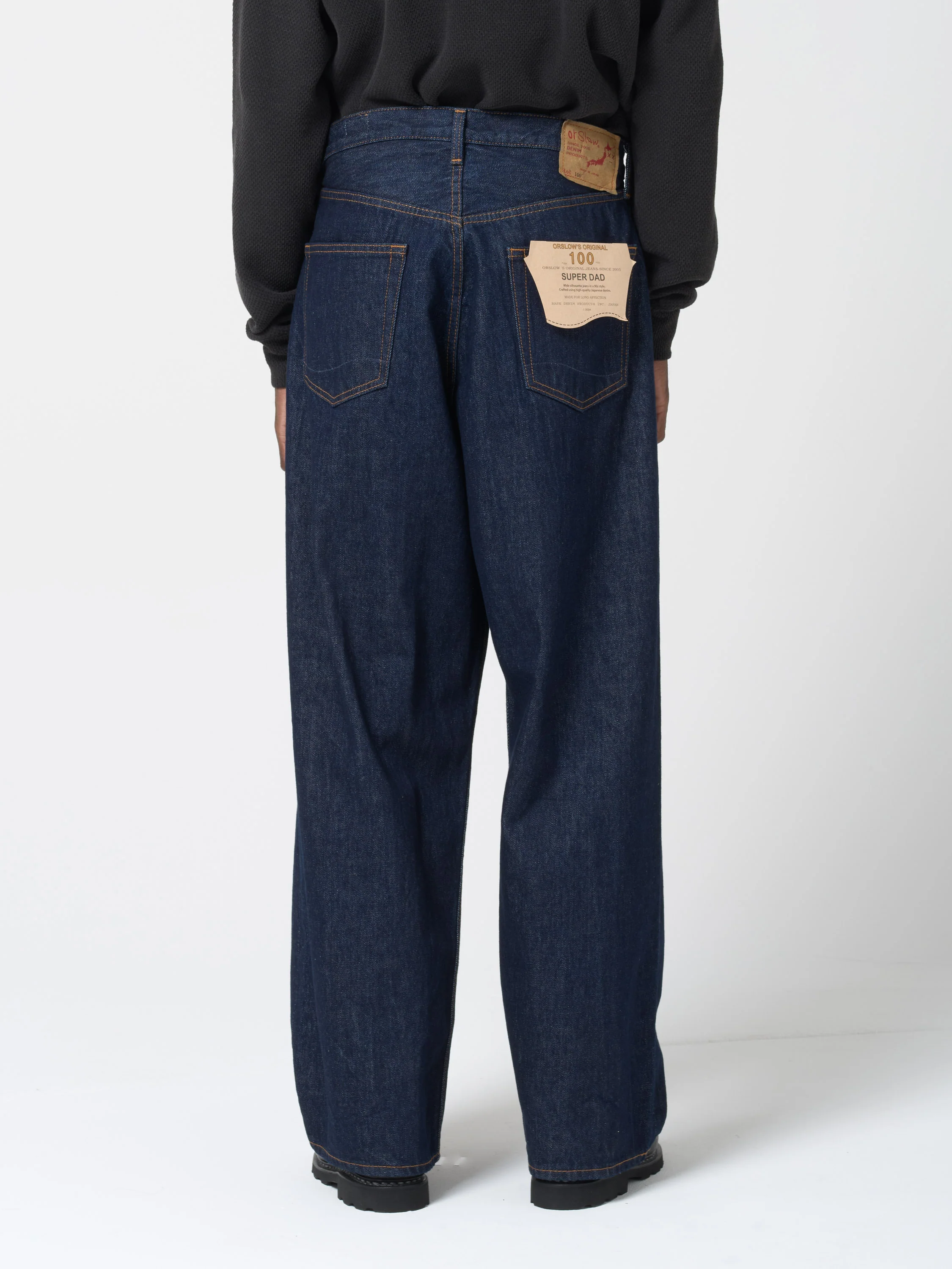 Le Super Dad’s Denim à une taille haute et une coupe large, droite, offrant un confort maximal et une silhouette audacieuse. Confectionné en denim brut japonais de 13,5 oz. Les détails fonctionnels incluent une braguette à fermeture éclair, deux poches avant avec une petite poche à monnaie et deux poches arrière.