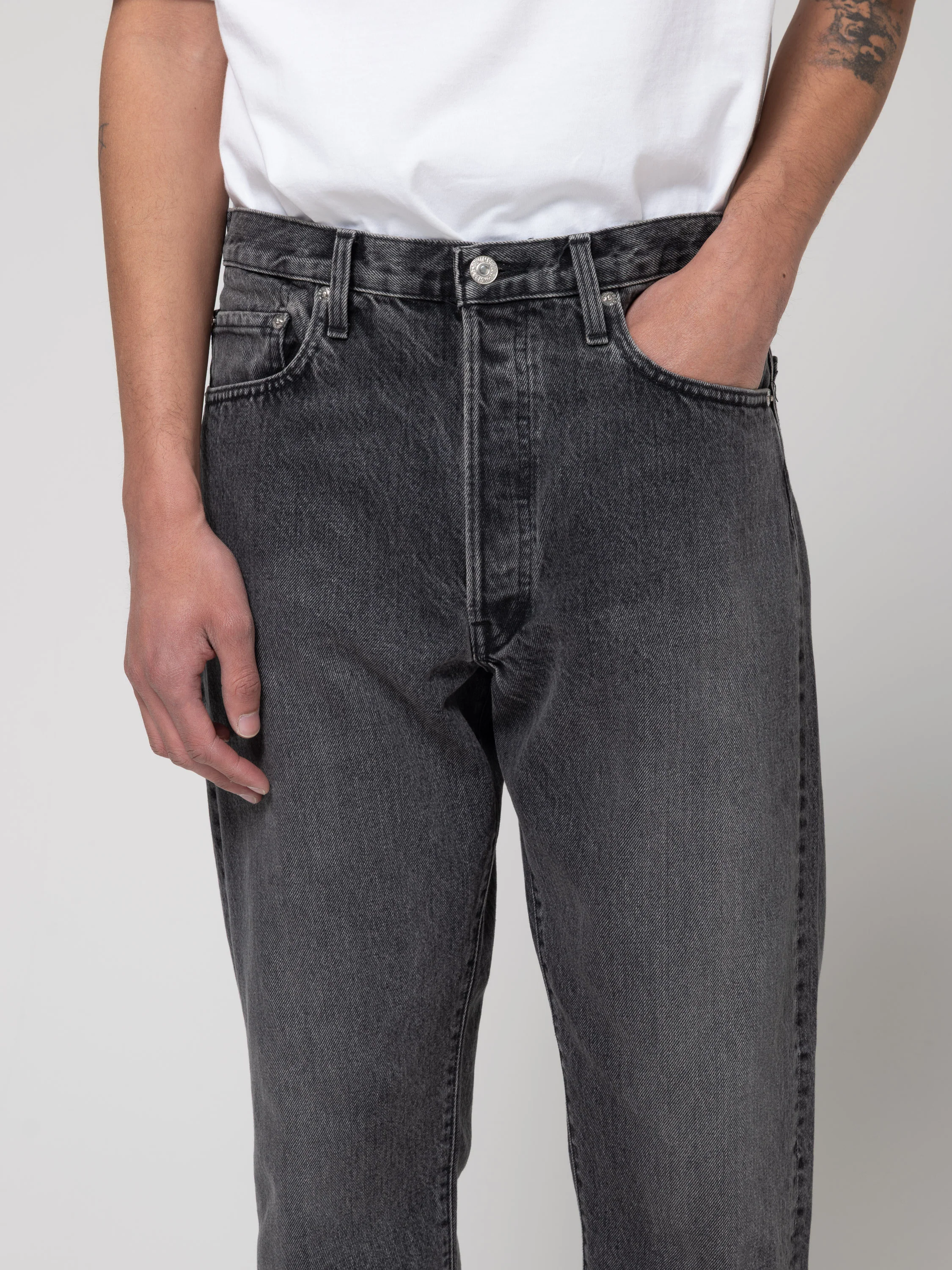 S'inspirant de la mode denim rétro du milieu du vingtième siècle, ce jean est soigneusement fabriqué au Japon en utilisant un denim exclusif de 13.5oz tissé à l'aide de métiers à navette. Le denim noir avec une finition stone wash, une sensation nostalgique semblable aux tendances de la mode de l'époque des années '90 tout en offrant un confort et une apparence classique qui ne se démode jamais. Le 105 est un jean avec une coupe droite, une taille moyenne, une fermeture à boutons, des rivets argentés.