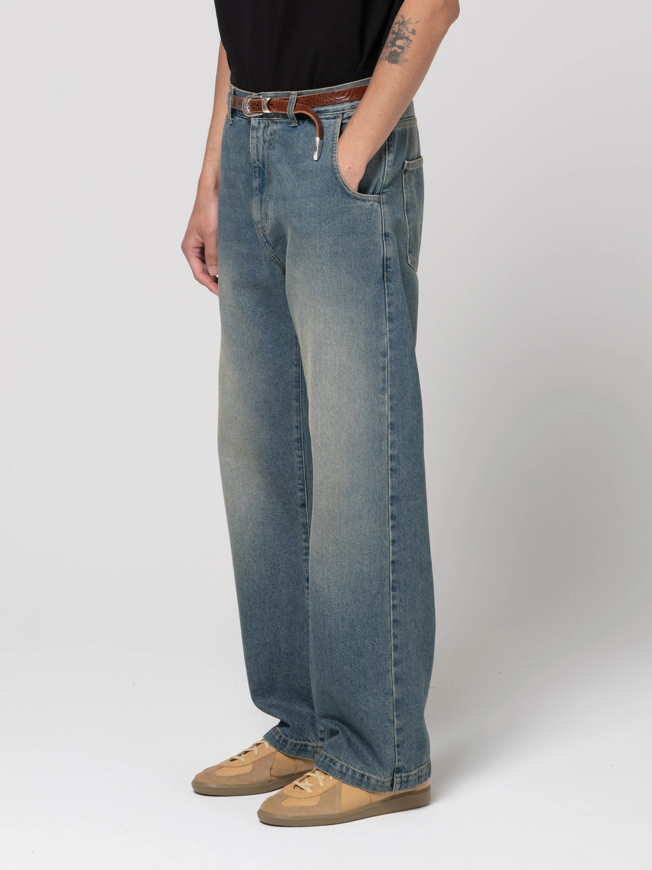 Ce vêtement est réalisé à partir d'un denim soigneusement sélectionné et bénéficie d'une finition étudiée pour un effet vintage. Chaque pièce est unique par sa teinte et son caractère. Au fil du temps et de l'usage, le jean évoluera naturellement et acquerra des caractéristiques uniques. Pour préserver ses qualités originales et limiter la décoloration, nous recommandons de le laver à l'envers.