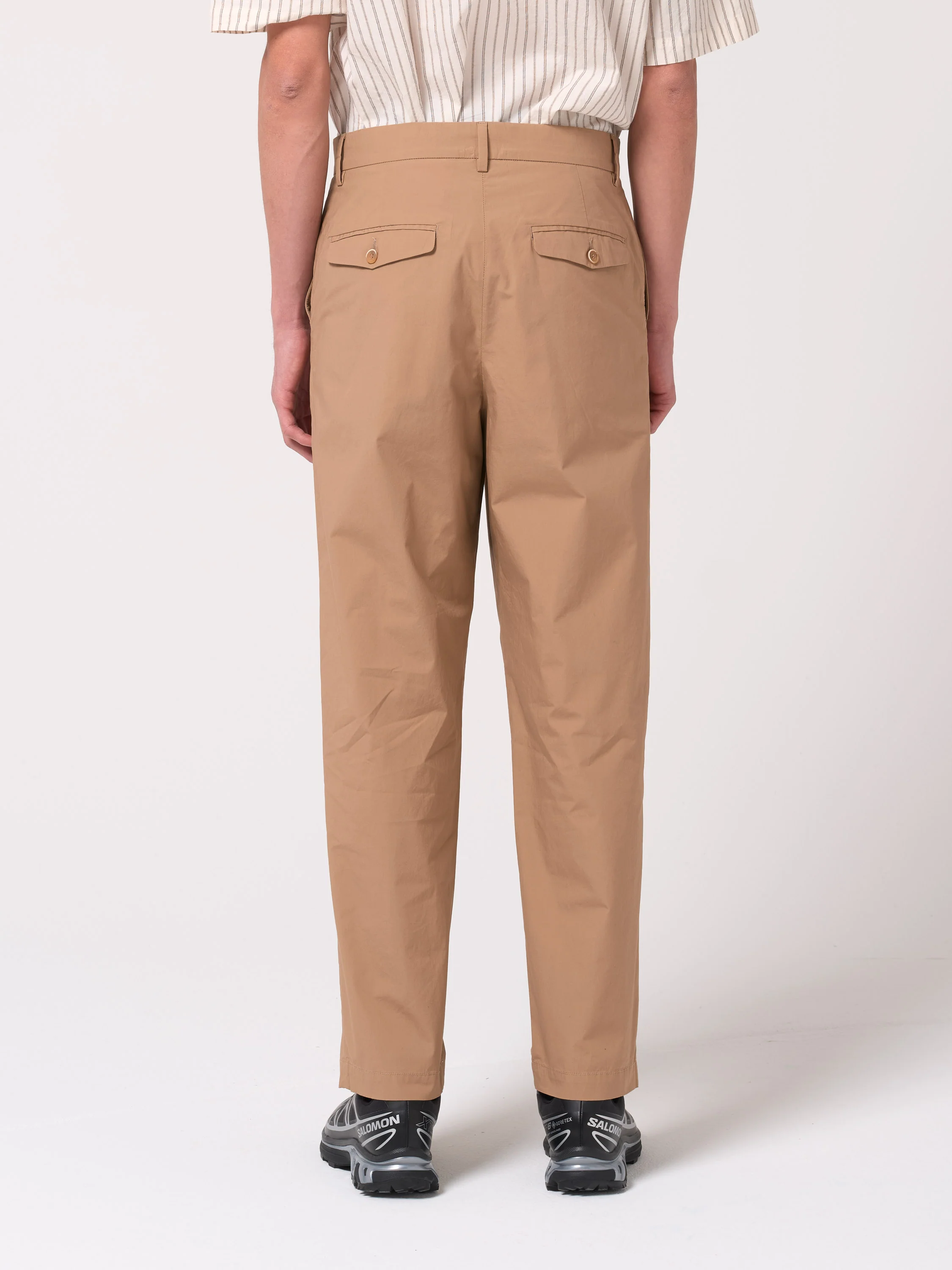 Ce pantalon est confectionné dans une popeline parachute lisse et matte. La coupe offre un confort optimal aux cuisses et vient de resserrer légèrement à partir du genou. Les détails comprennent deux poches fendues et deux poches arrière passepoilées avec rabat et bouton.
