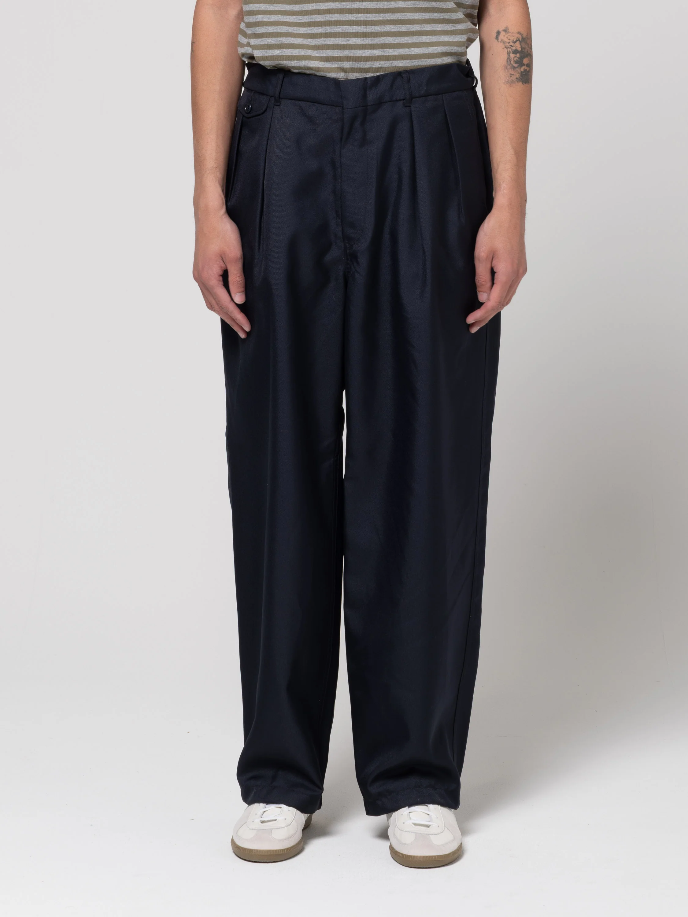 Pantalon large à deux plis, coupe droite, confectionné en sergé de polyester. Cordon de serrage à la taille pour un ajustement personnalisé. Braguette zippée sur le devant. Entrejambe à soufflet pour une plus grande liberté de mouvement.