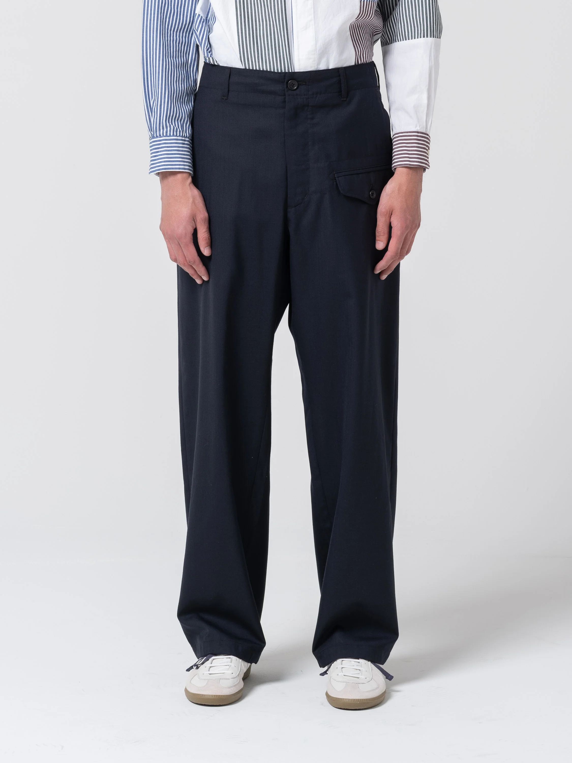 Fabriqué dans une laine tropicale fluide et légère, ce pantalon est à mi chemin entre le chic et le workwear. Coupe large et droite, poches à rabat sur la jambe gauche et dans le dos. Vous pouvez l’assembler avec la veste Loiter afin d’avoir un ensemble parfait.