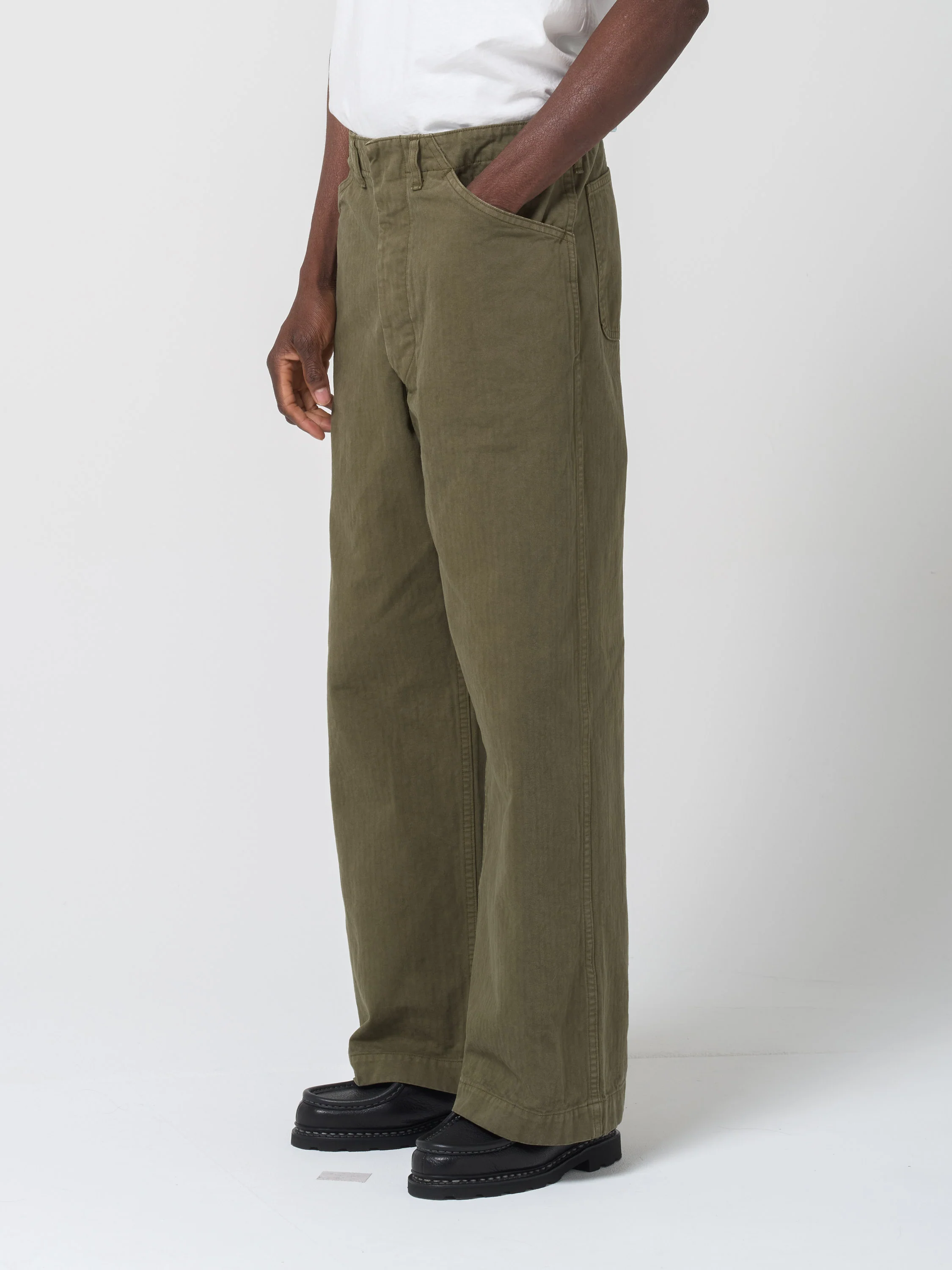 Ce pantalon est inspiré d’un pantalon de l’US Marine. Avec son design relativement minimaliste pour un pantalon militaire, il est confectionné dans une toile de coton à chevrons dense et structuré. Coupe ample, poche en biais, deux poches à l’arrière.