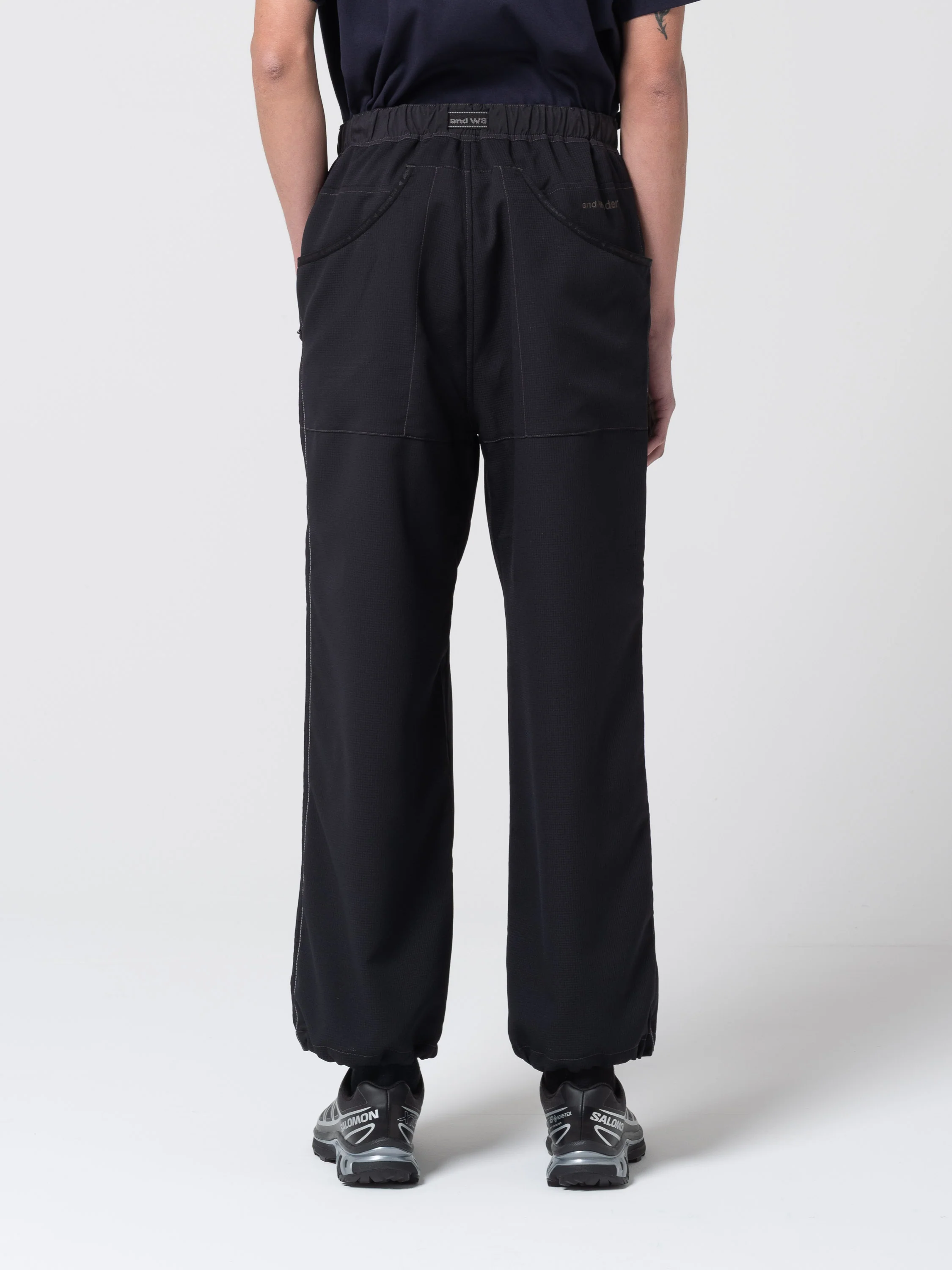 Ce pantalon Vent Pants de la marque And Wander est fabriqué dans un tissu gaufré unique, respirant et déperlant. Il s'agit d'une jambe large confortable dotée d'une ceinture intégrée élastique et réglable, d'une braguette zippée et d'un cordon de serrage réglable à l'ourlet. Deux poches latérales zippées et deux poches à l'arrière.