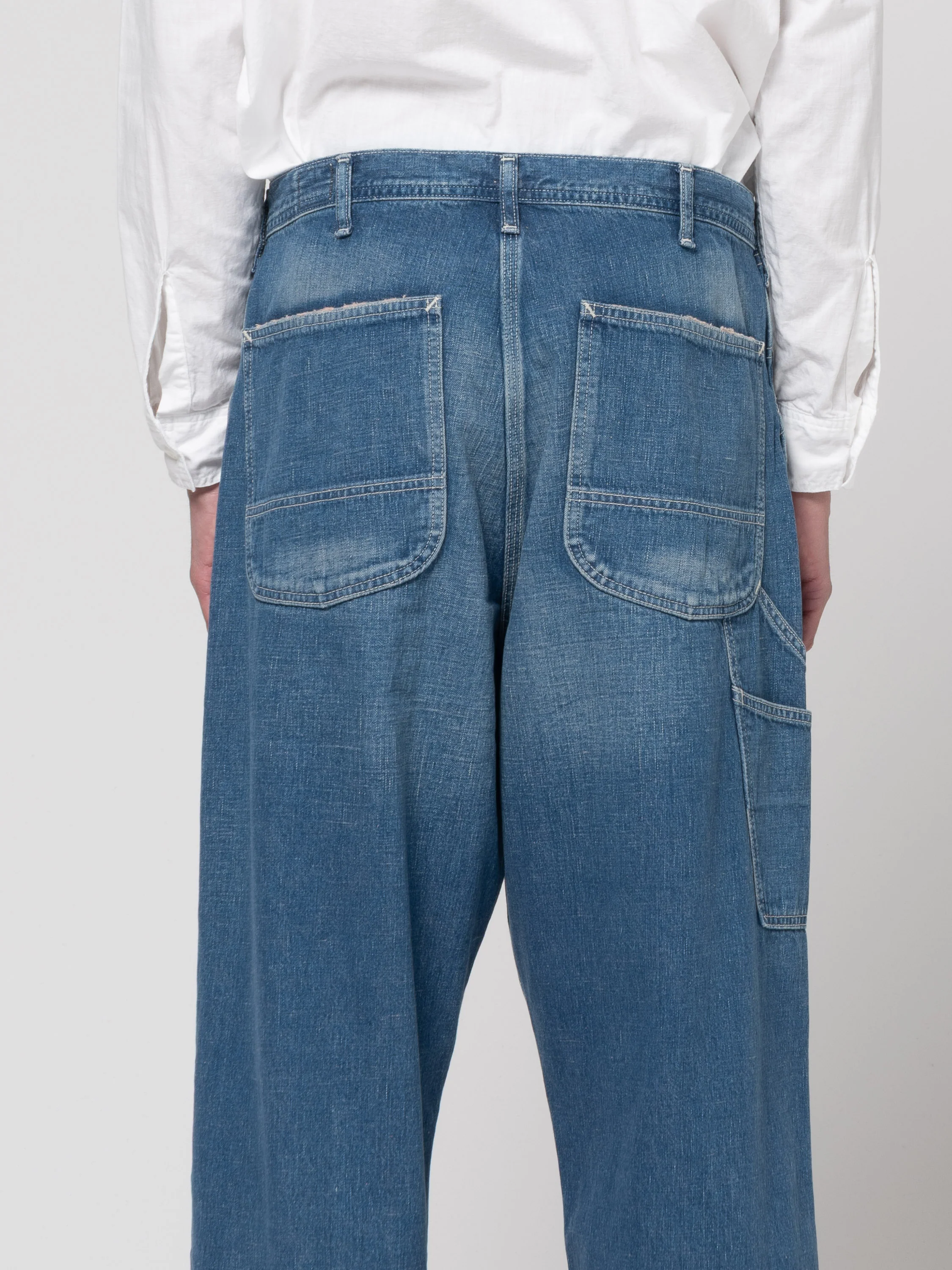 Le pantalon large 30's Painter Pant de orSlow est fabriqué en denim japonais de première qualité avec un délavage vintage. Ce jean à taille haute et à jambe droite présente une construction à cinq poches, des coutures blanches contrastées et une braguette zippée avec fermeture à bouton-pression. Fini avec des rivets en cuivre vieilli, ce style offre un look workwear avec un confort quotidien.