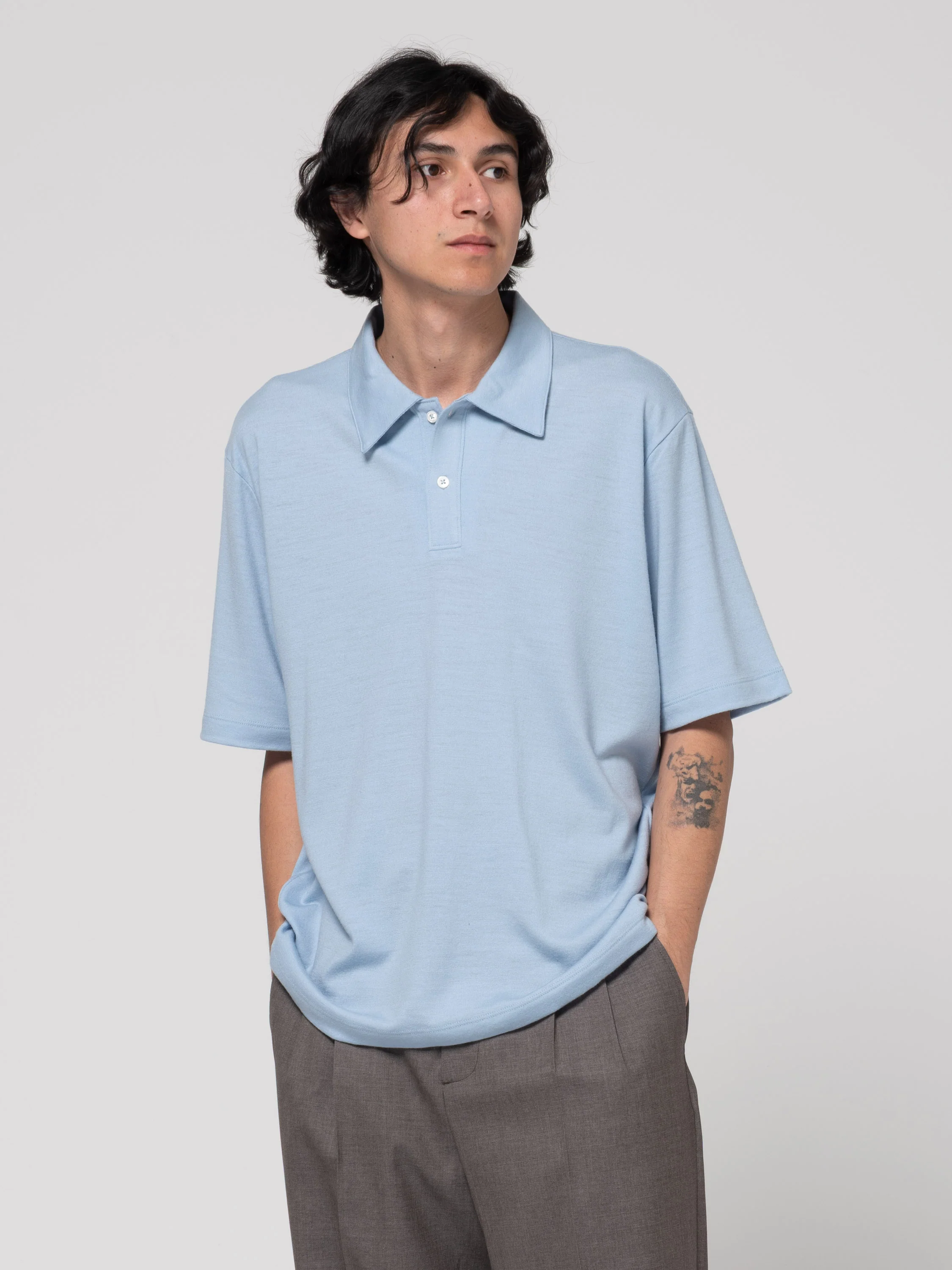 Polo à coupe ample avec un col régulier, des manches mi-longues et une longueur standard. Il est coupé dans un jersey de laine respirant, offrant un tombé fluide et une texture douce et rebondie, équilibrant ainsi la silhouette. L'apparence décontractée contraste avec la finesse du tissu.