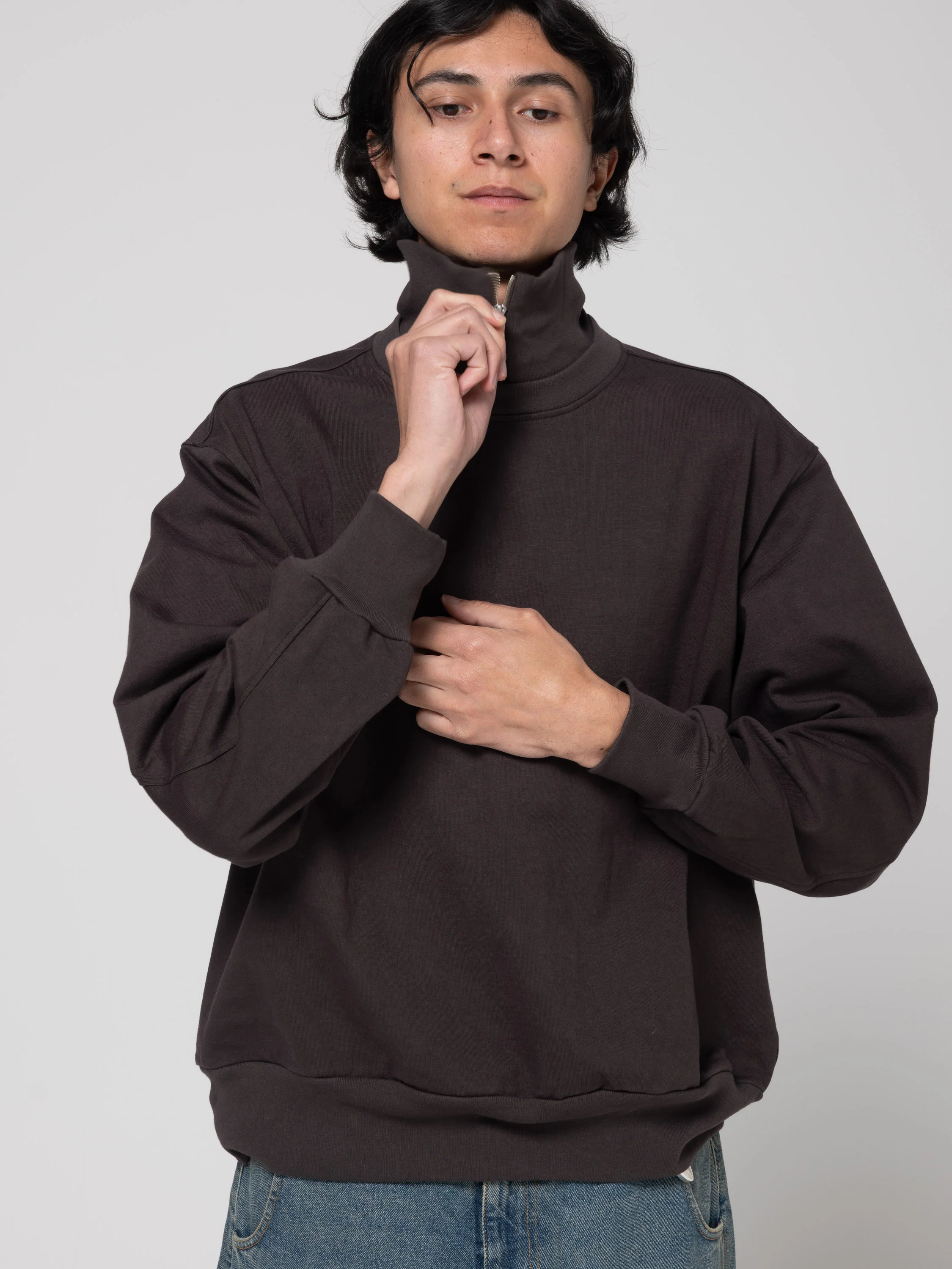 Ce sweat-shirt à col montant zippé présente une coupe ample et décontractée. Ses épaules tombantes et ses larges emmanchures créent une silhouette fluide et permettent de le porter seul ou superposé. Confectionné dans un jersey très dense de 10oz, il offre un tombé élégant et structuré. Prélavé.
