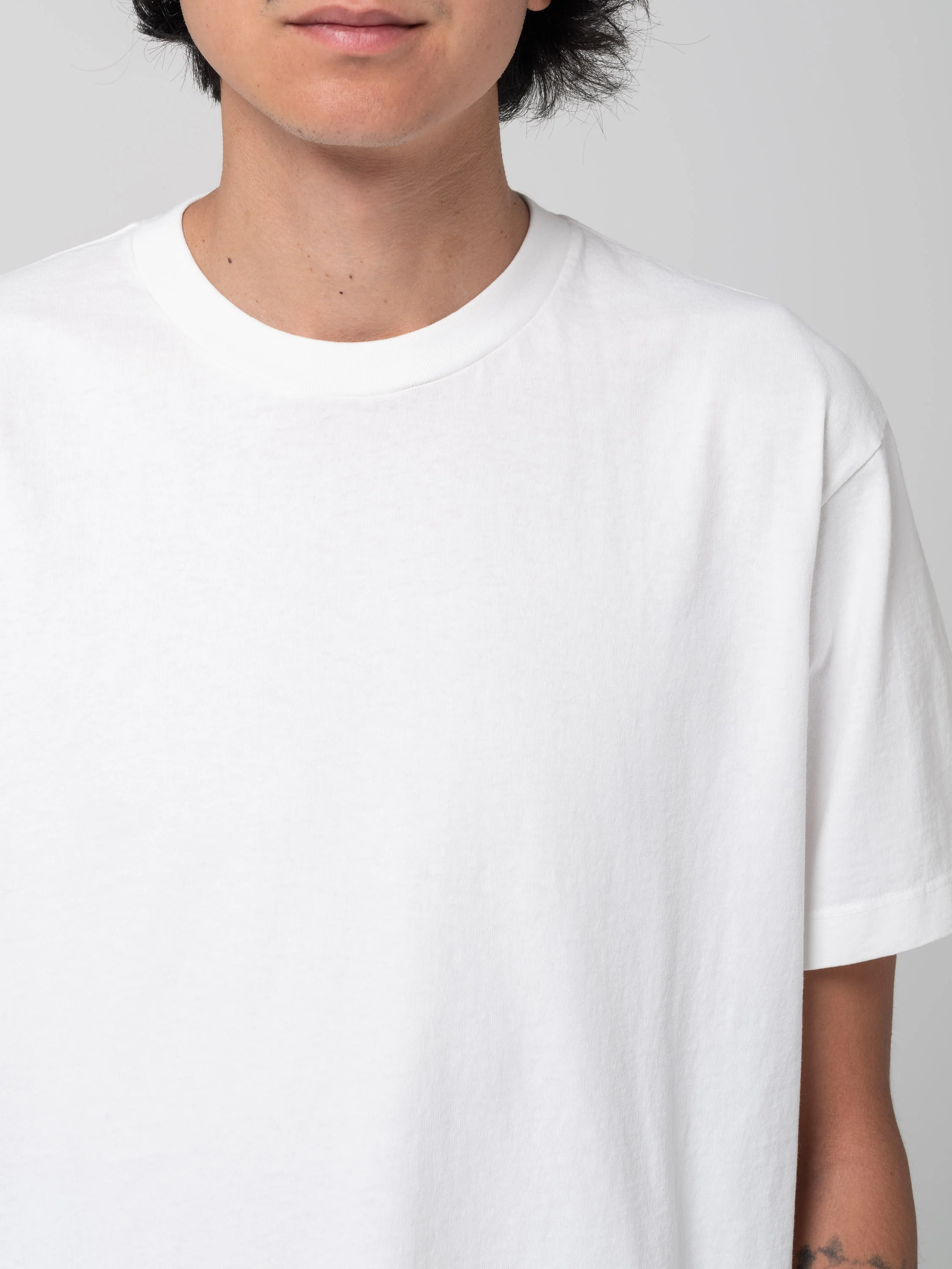 Le t-shirt municipal utilise un jersey cardé et sec. Fabriqué à partir de coton américain provenant des fermes de Caroline du nord. Encolure ajustée, coupe droite avec des épaules légèrement tombantes. Le jersey a une main rigide qui va s’assouplir au fur et à mesure des lavages.