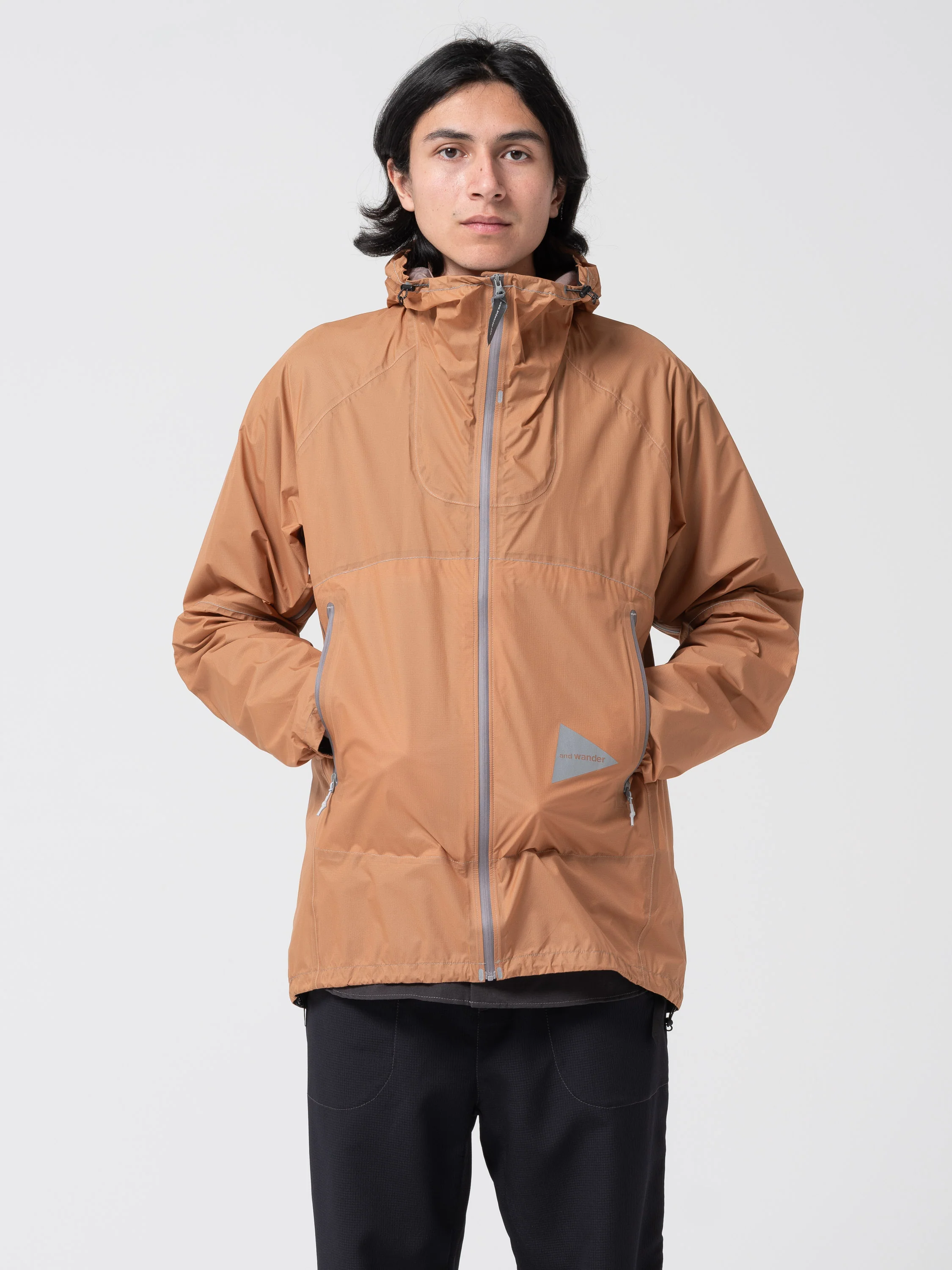 Cette veste 3 couches And Wander est ultra-légère. Elle est fabriquée en tissu ripstop nylon Pertex® Shield, fin mais durable, et est recouverte de PU pour empêcher la pénétration de la pluie et de la neige. Des ventilations stratégiques situées sous les aisselles permettent une régulation de la température lors de conditions météorologiques difficiles. Des coutures réfléchissantes partielles sont intégrées sur l'ensemble du vêtement pour la visibilité nocturne. Elle dispose de fermetures éclair invisibles de couleur neutre, de cordons de serrage style bungee au col et à l'ourlet, ainsi qu'un sac de transport en nylon pour un rangement facile.