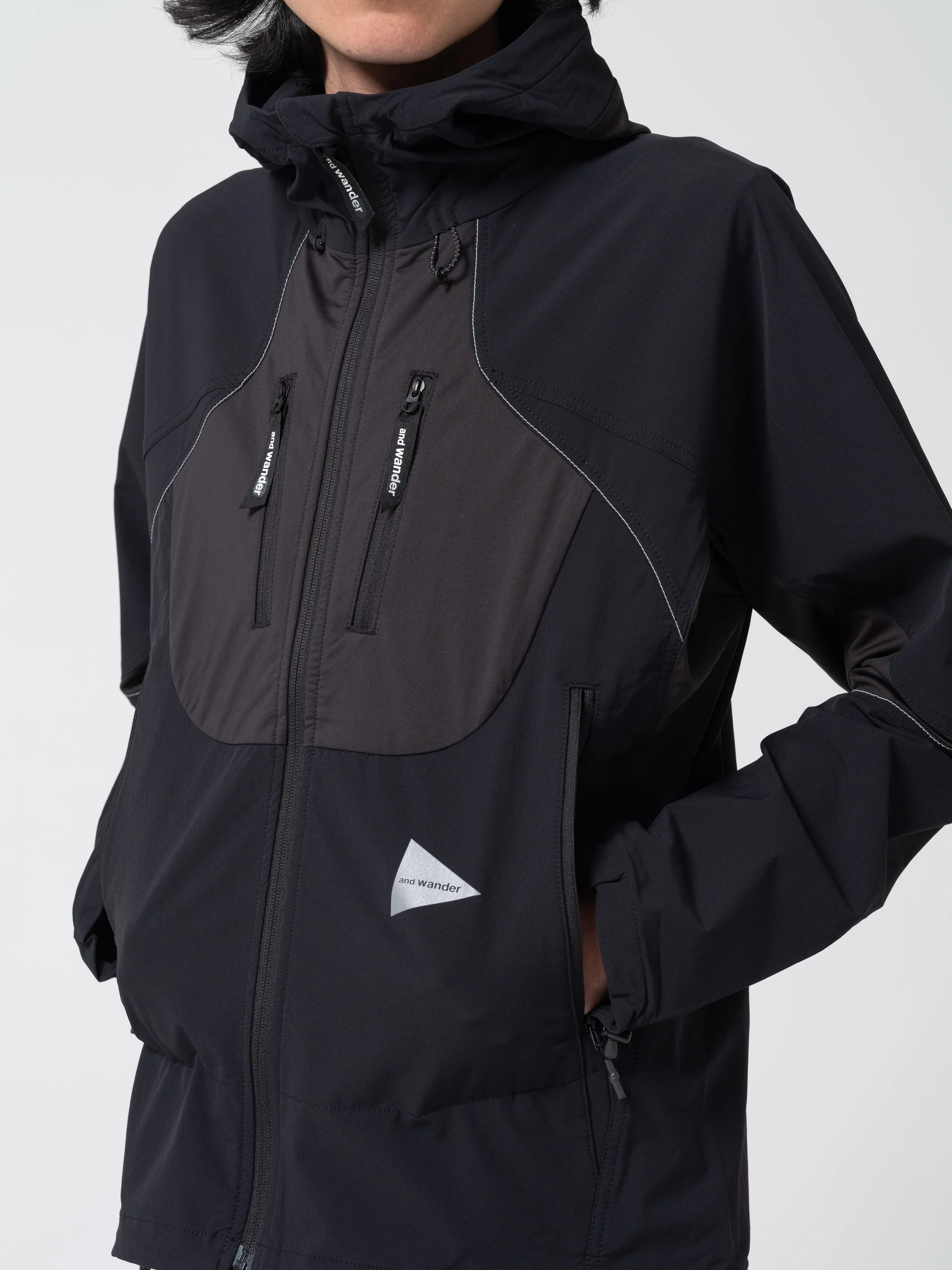 La veste Trek 3 est un vêtement technique fabriqué à partir d'un matériau durable et déperlant, conçu avec le ZGRAV, un tissu stretch à double tissage. La capuche et les soufflets sous les bras, ces derniers permettant une meilleure liberté de mouvement, utilisent du jersey pour réduire les bruits de la pluie et les frottements, tout en empêchant la raideur. Des coutures réfléchissantes sont ensuite intégrées sur l'ensemble de la silhouette pour améliorer la visibilité de nuit.